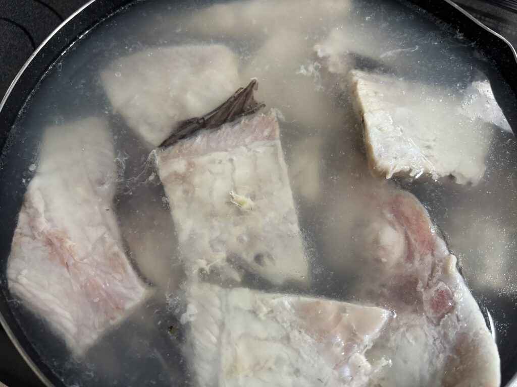 鍋にお湯を沸かし、沸騰したら火を止める。 鯛のあらをすべて入れ、数分置いてから水洗いして鱗や汚れを落とす。