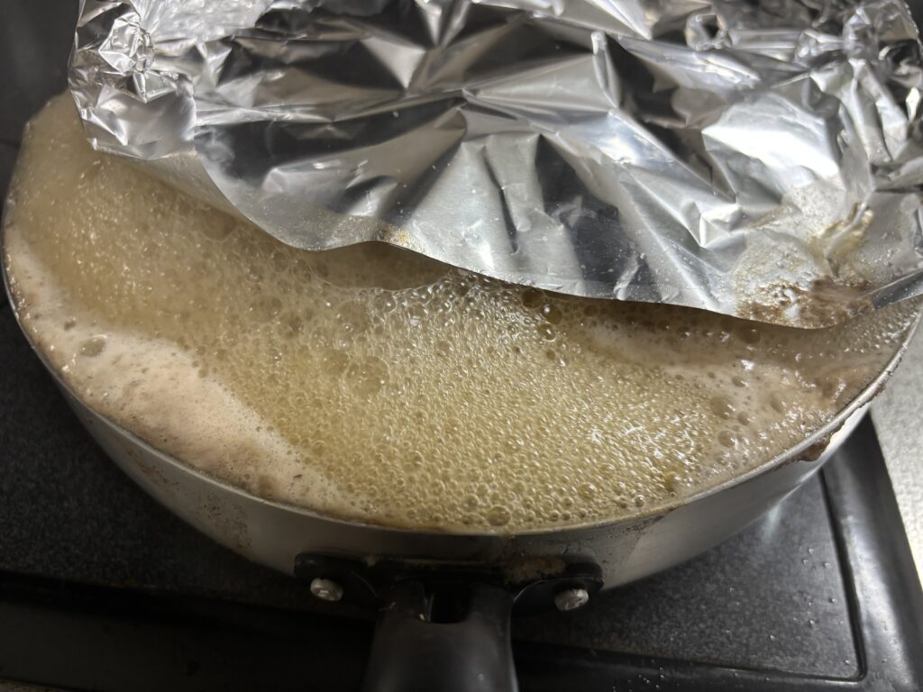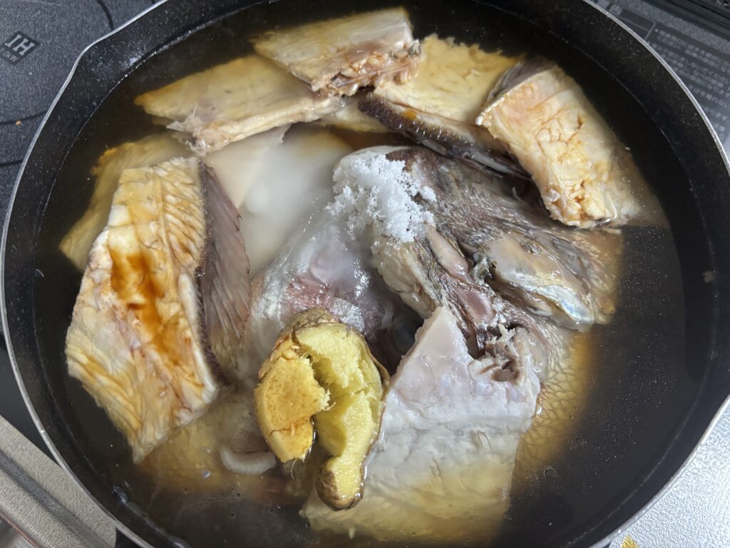 鯛カブトとアラ骨に火が通ったらいったん取り出す。 次回の「鯛めし」で使うので、煮崩れ注意で優しく扱う✨このタイミングで鯛めし用に280gの煮汁を取り分けておく🍚✨