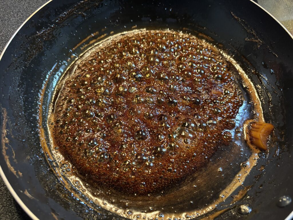 煮汁を強火で煮詰め、とろみが出てきたら味見して調整。