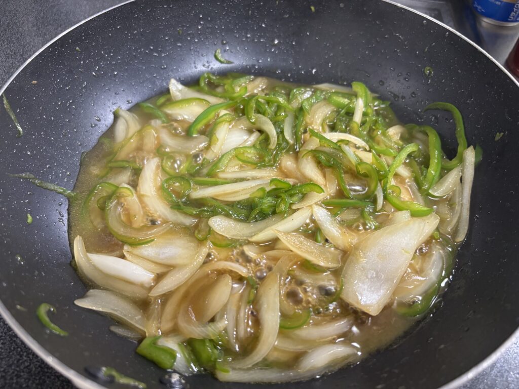 - くし切りにした玉ねぎ🧅・千切りピーマン🫑を入れて炒めます。