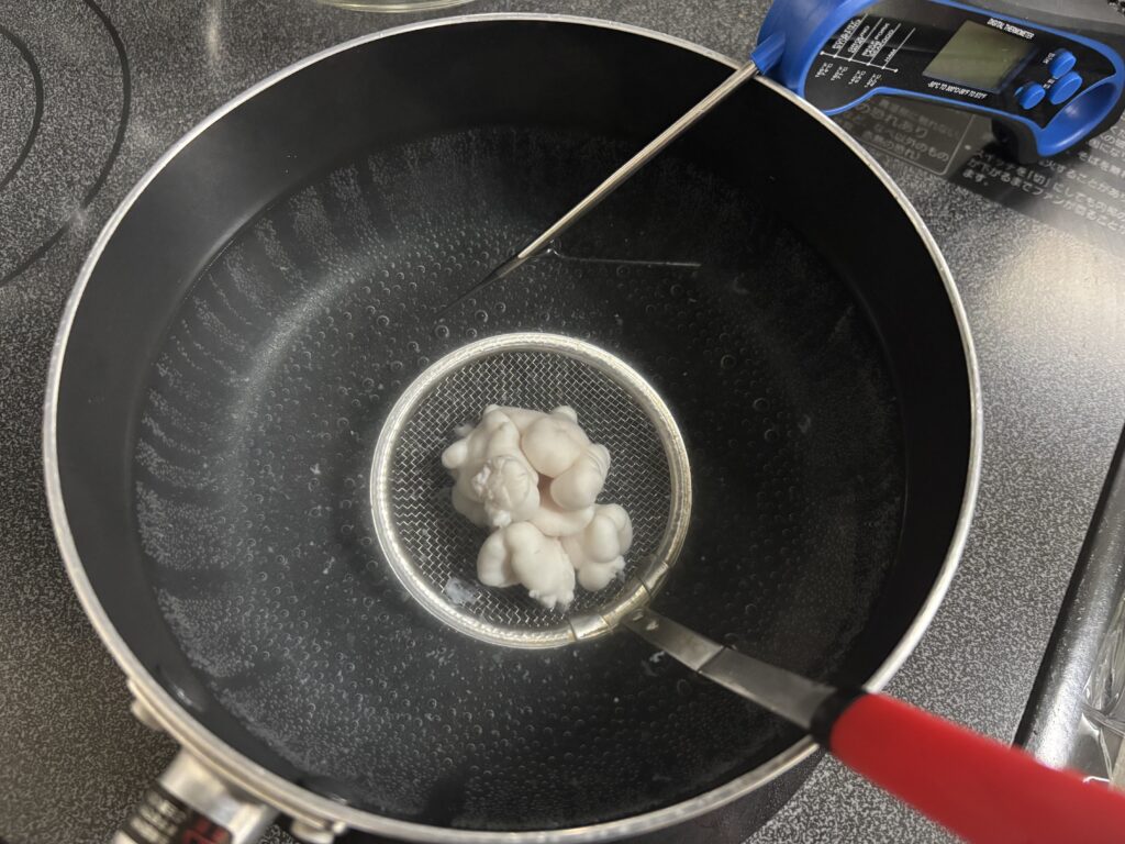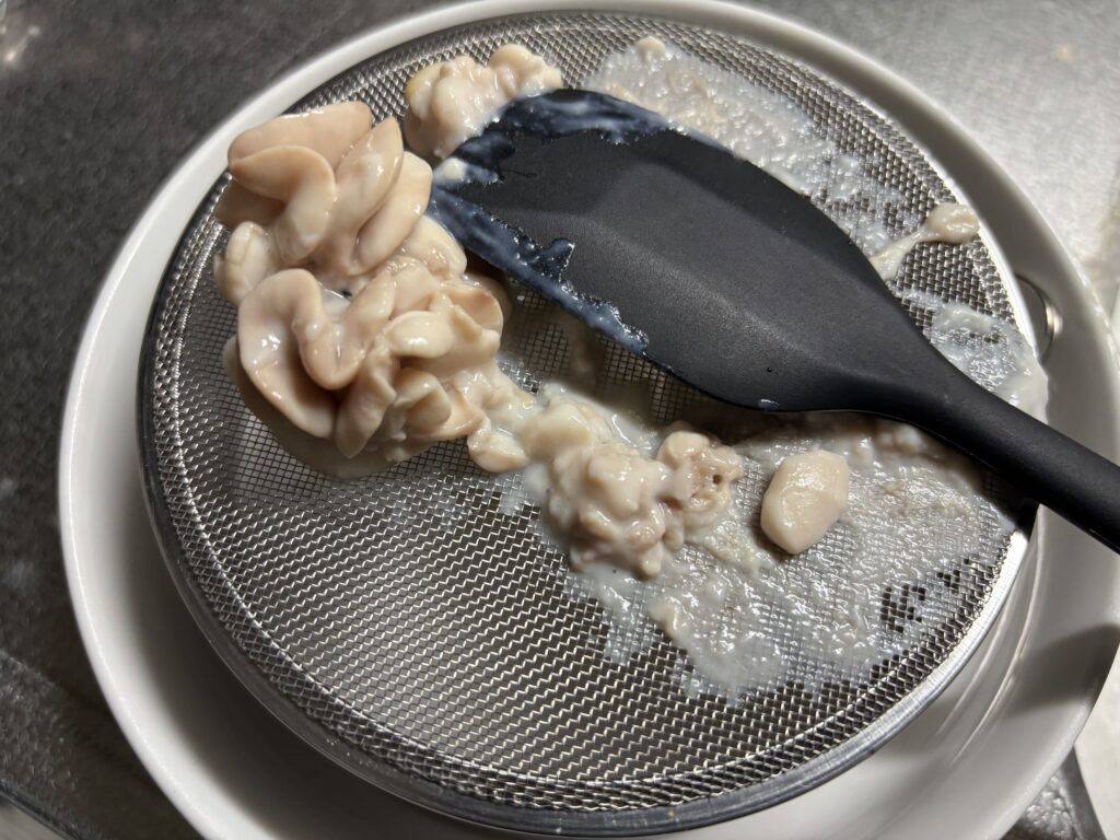 残りの白子をまとめて80度のお湯♨️に入れ、1〜2分茹でる。茹で上がったら裏ごししてなめらかにする。