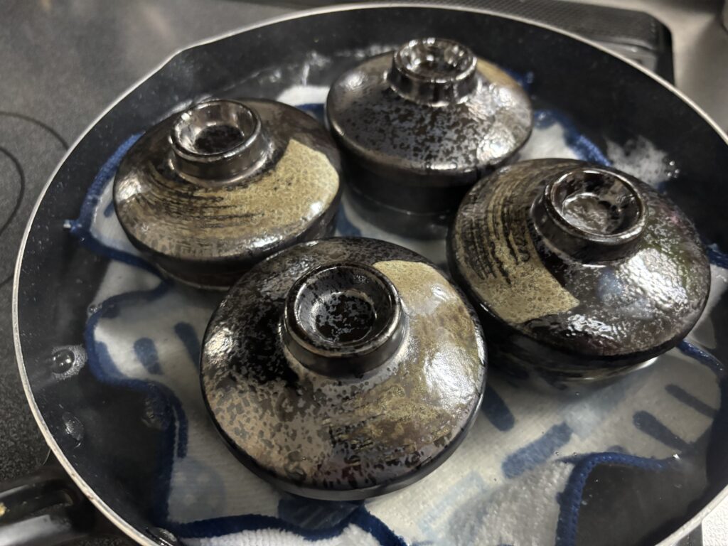 フライパン🍳に布巾を敷いて器を並べ、水💧を器の8割ほど入れる。強火🔥で沸騰したら、中火で8分 → 少し強めの火でさらに8分蒸す。