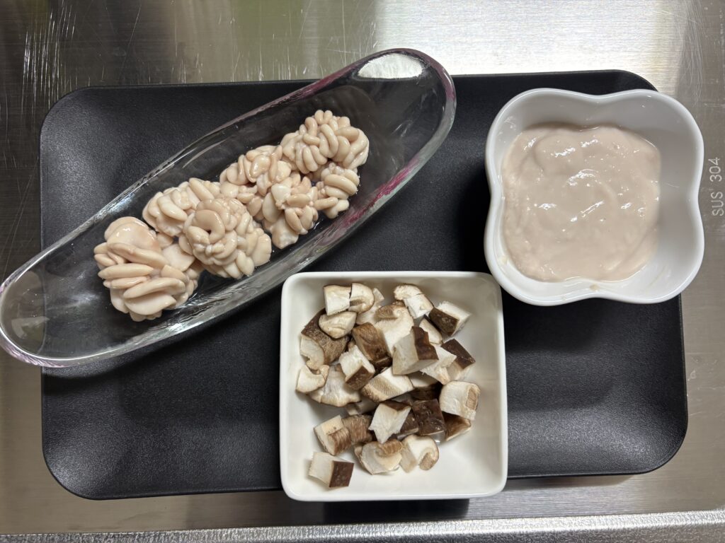 たら白子をハサミ✂️で一口大に切り、水洗いして汚れ・筋・硬い皮を取り除く。形の良い白子4個は飾り用として80度のお湯♨️で1分ゆで、ペーパーで水気を切る。