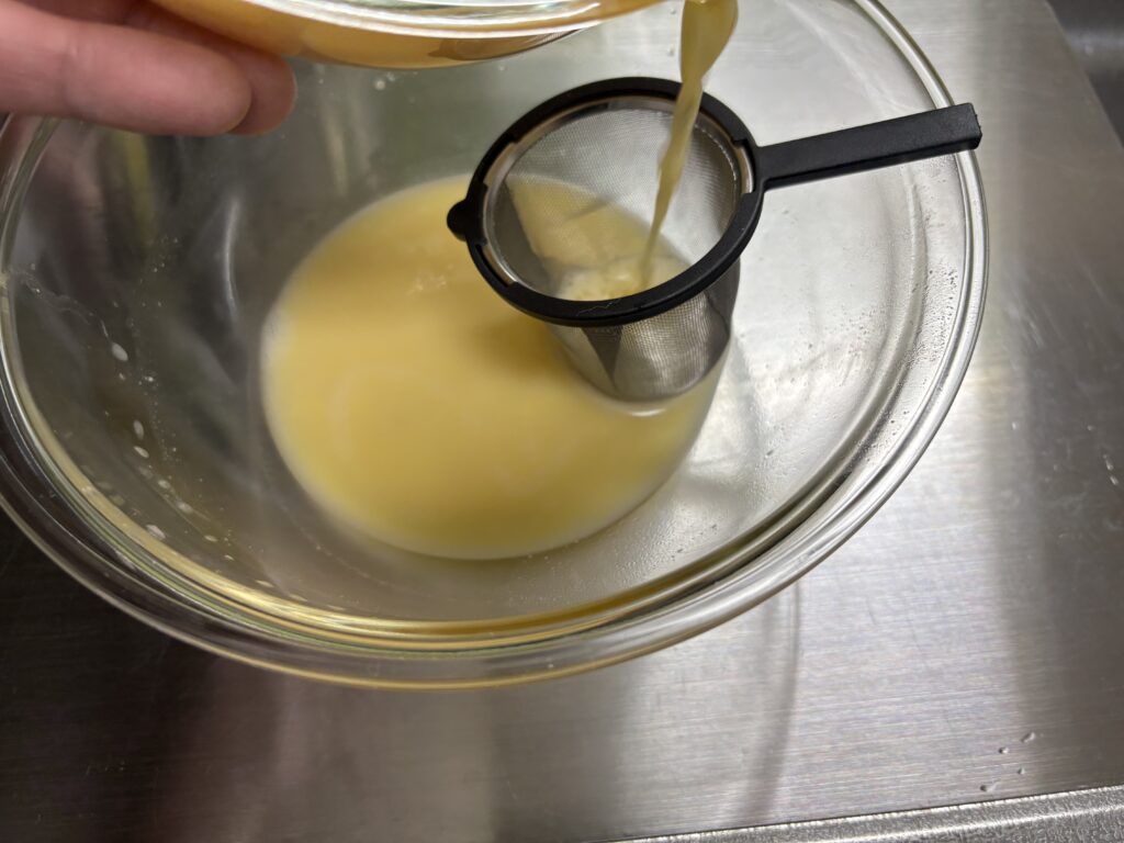 ボウル🥣に玉子🥚を入れてホイッパーで軽く混ぜる。別のボウル🥣に水💧・塩🧂・裏ごしした白子を加えて混ぜ、玉子液と合わせる。茶こしでこし、なめらかな卵地に仕上げる。