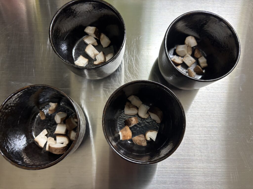 器に角切りの椎茸🍄🟫を入れ、こした卵地を均等に注ぐ。