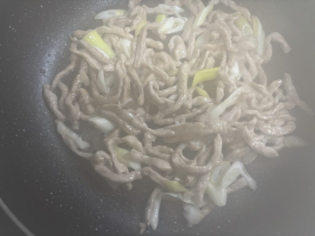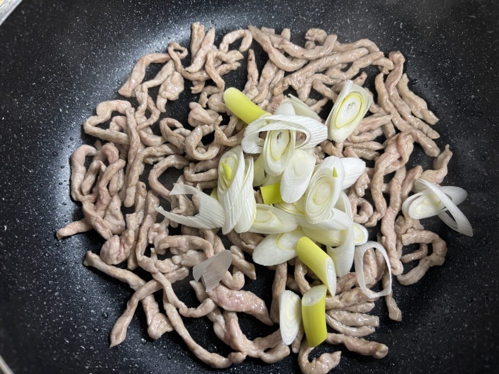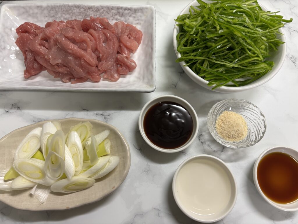 - ピーマンは細切り、豚もも肉も細切りに。長ネギは大きめに斜め切りにします。