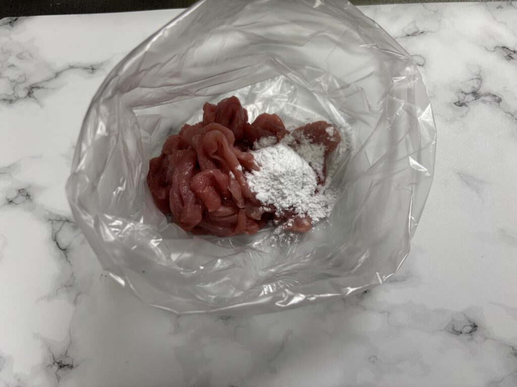- ポリ袋に切った豚肉と片栗粉を入れ、全体にまぶしておきます。