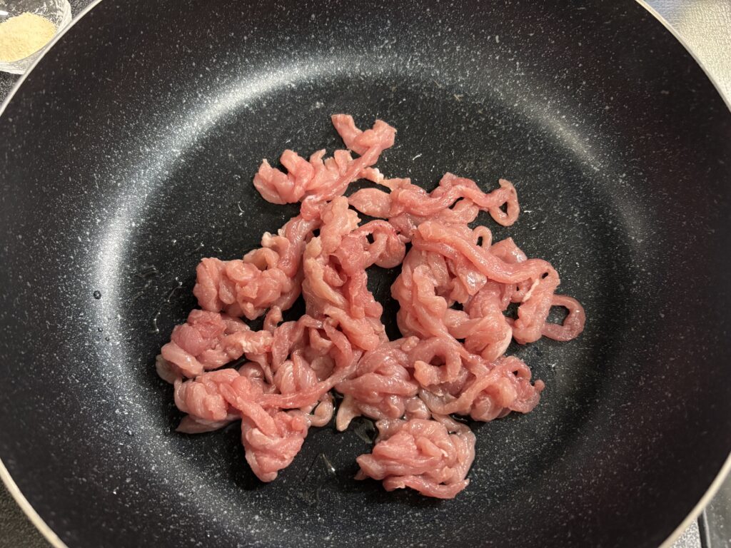 - フライパンに油を熱し、肉を炒めながら塩コショウで下味をつけます。