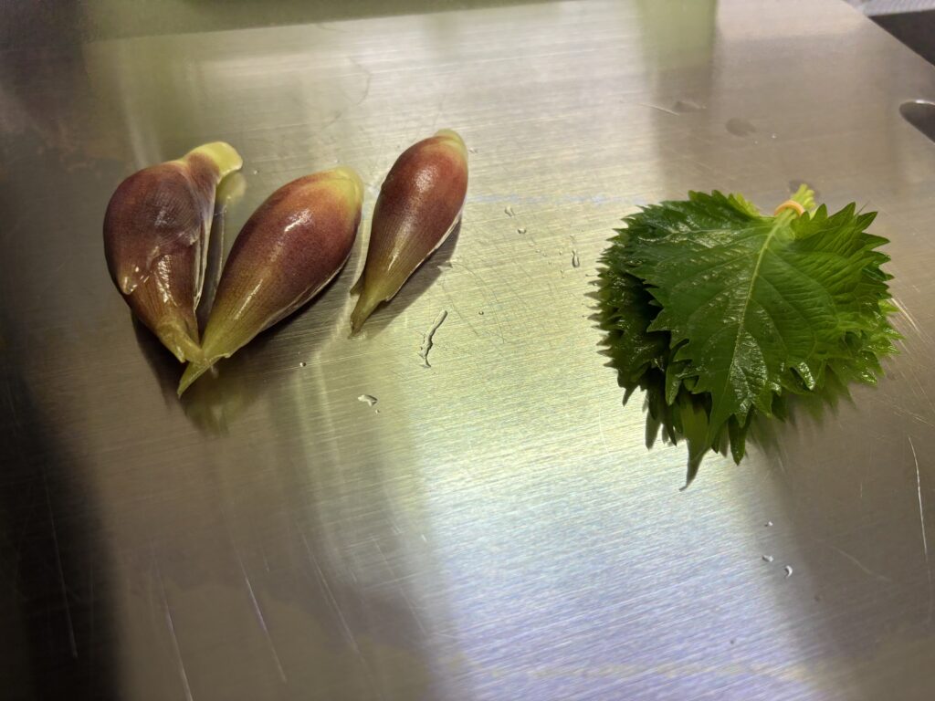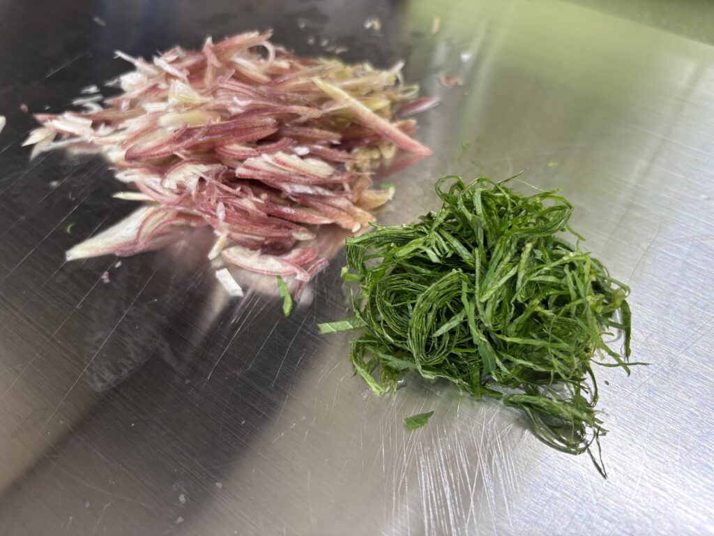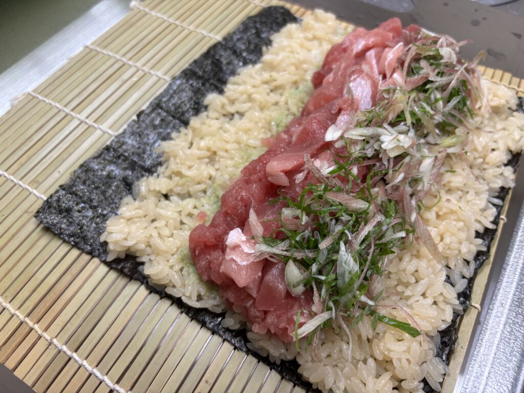 叩いたまぐろと細切りのまぐろ+薬味をのせて、同様に巻き上げます。