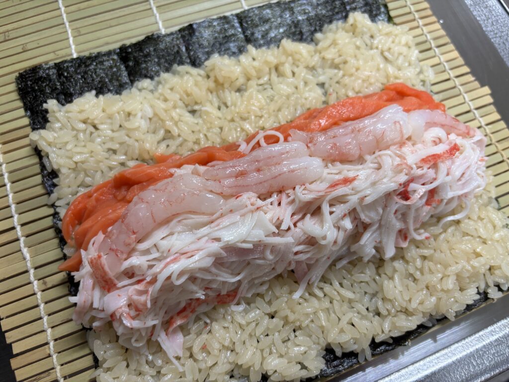 ④ 巻きすで具材を巻く①(サーモン・生海老・かにかまぼこ)