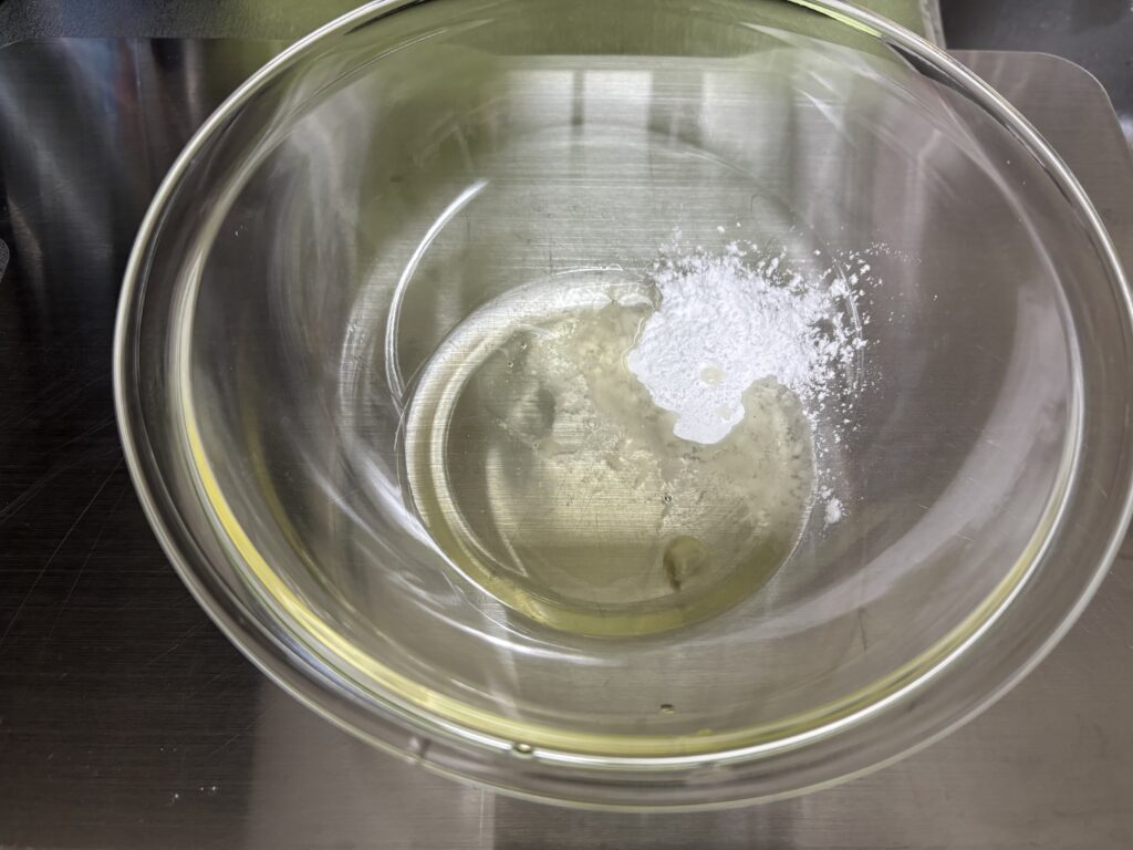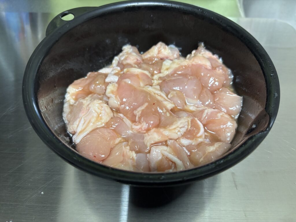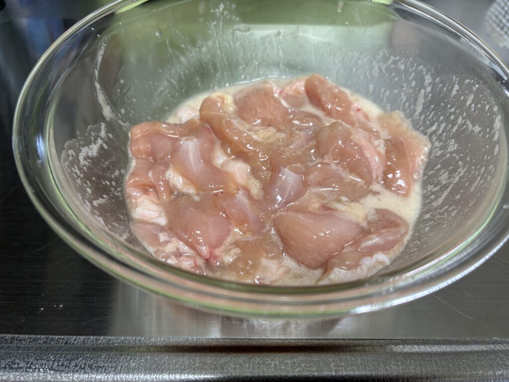 卵白と片栗粉を混ぜて、鶏肉を加えて全体をコーティング🙆♀️