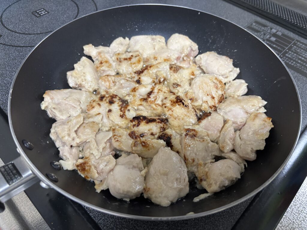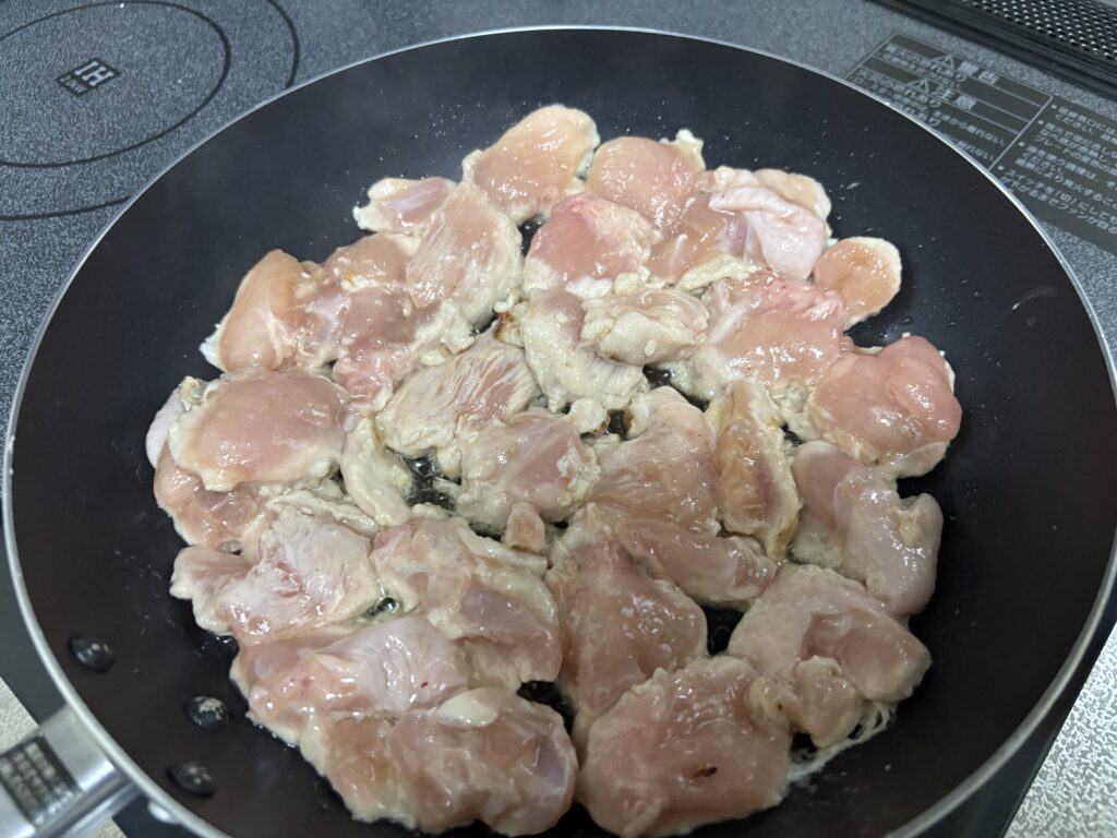 フライパンにサラダ油をひき、鶏肉を入れて強火で焼き色をつけます!