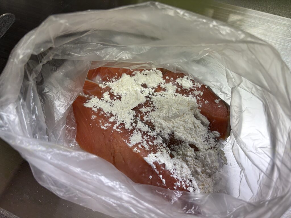 ③ 鮭に粉をまぶす🐟