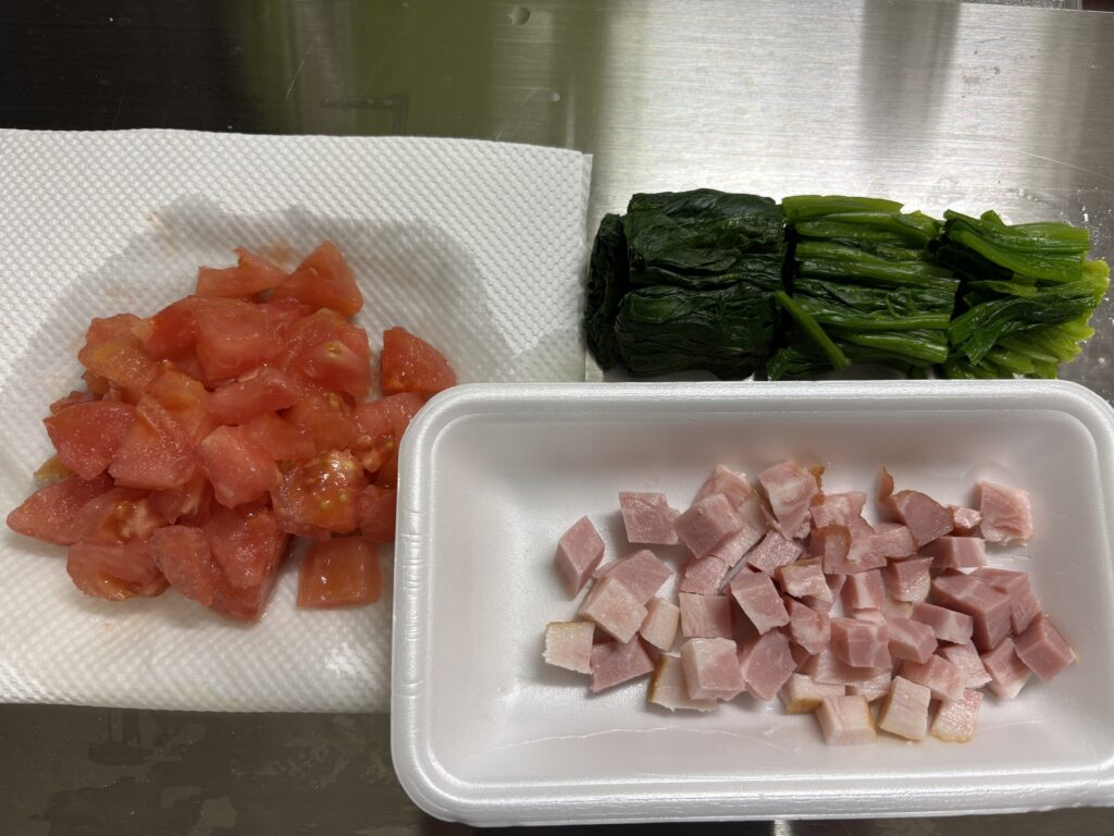 ほうれん草はゆでて食べやすい長さに切る。 トマトは湯むきして角切りにする。 ベーコンも角切りにする。