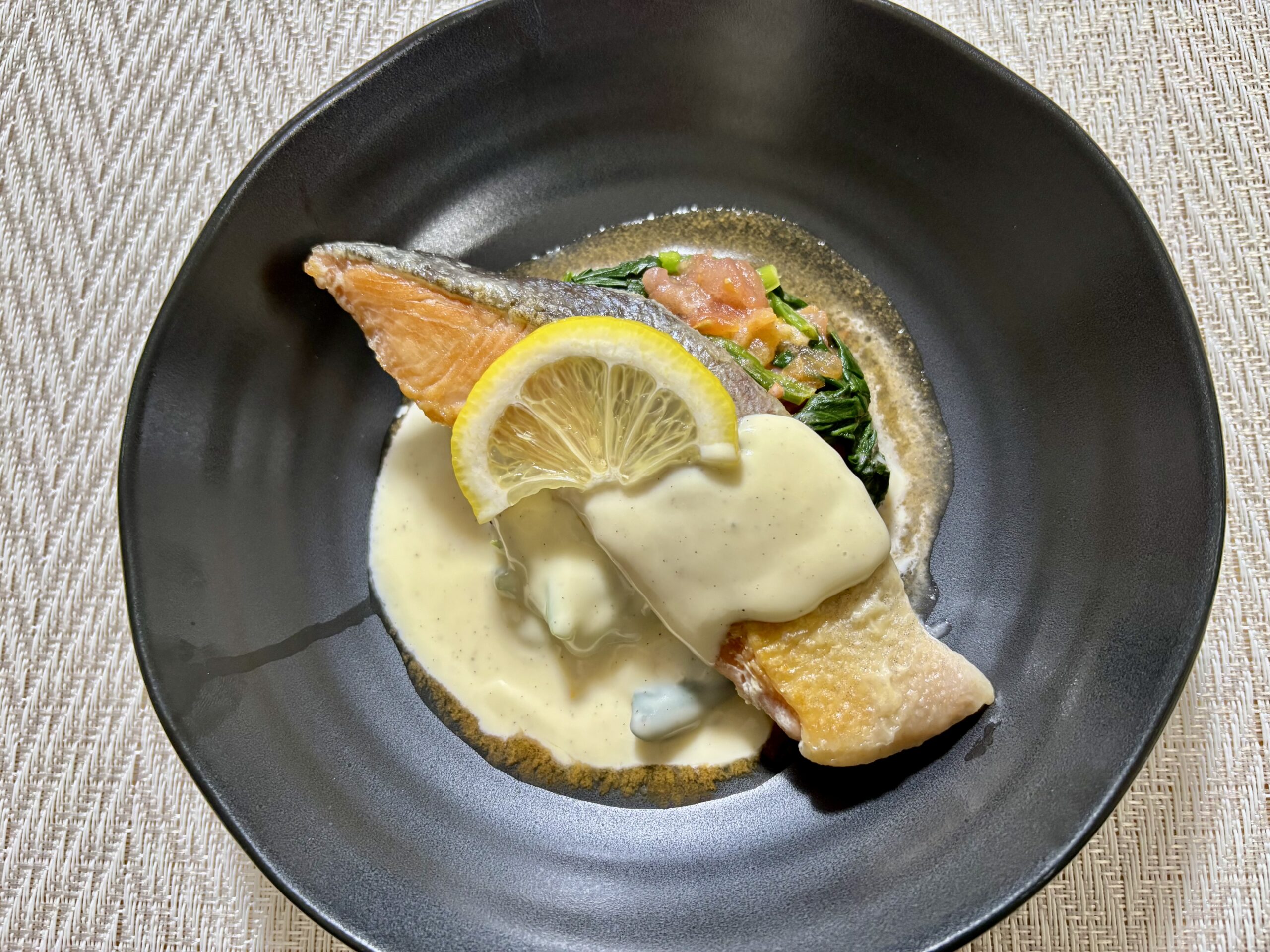 鮭にレモンマヨネーズソースをかけ、付け合わせを添えたら完成です🍽️✨