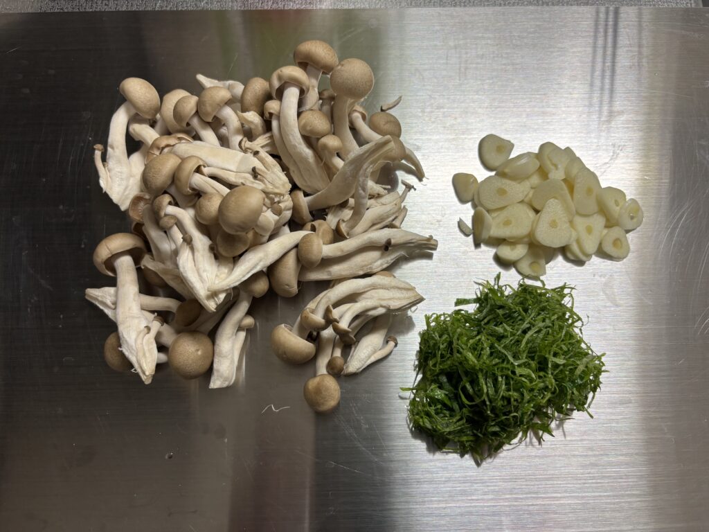 にんにくはスライス、大葉は千切り、しめじは石づきを取ってほぐしておく。