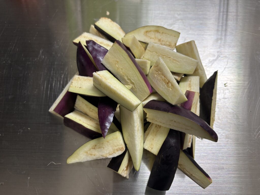 茄子は縦に6分の1に切り、さらに横半分にカットする。