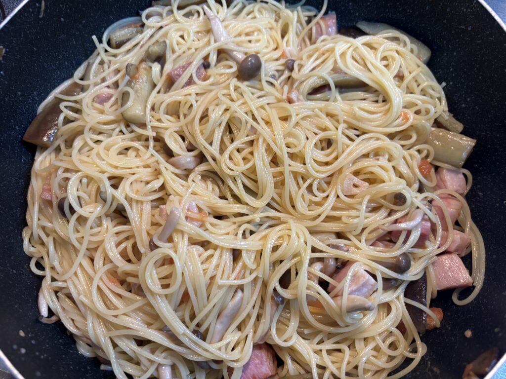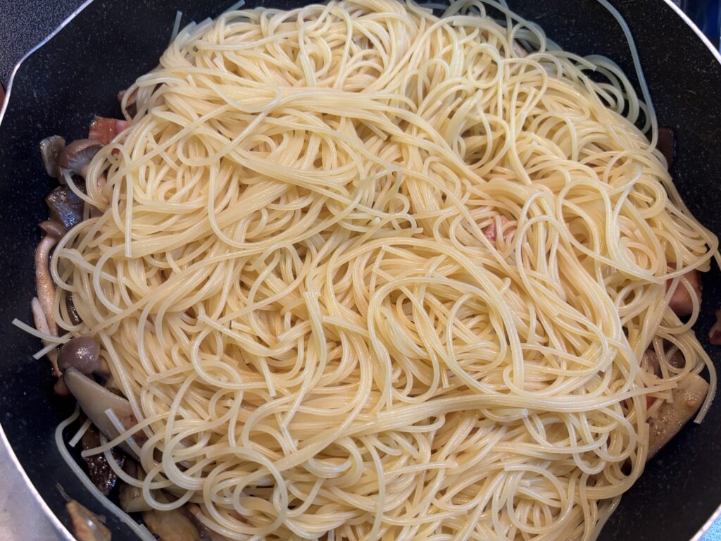 ④のフライパンにパスタを入れ、茹で汁おたま5杯を加える。