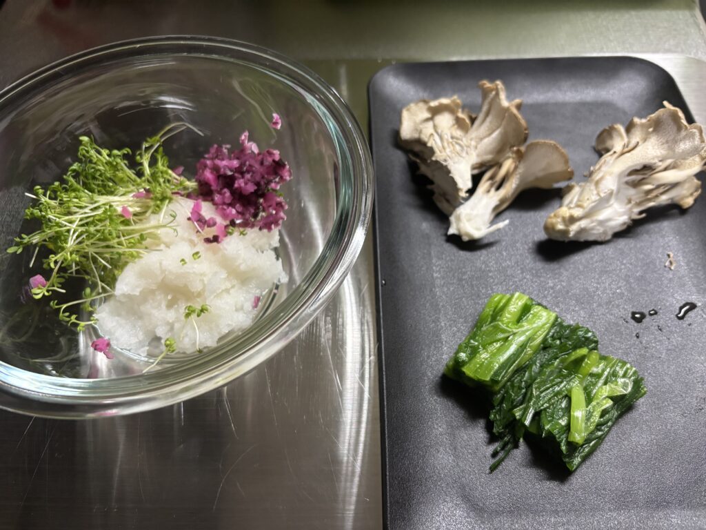 舞茸・ニラの彩り、大根おろしソースの爽やかさでごはんがどんどん進みます🍚✨