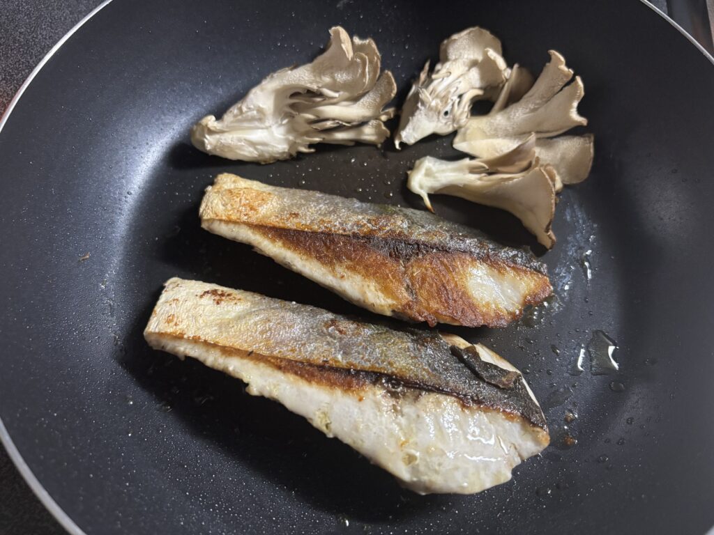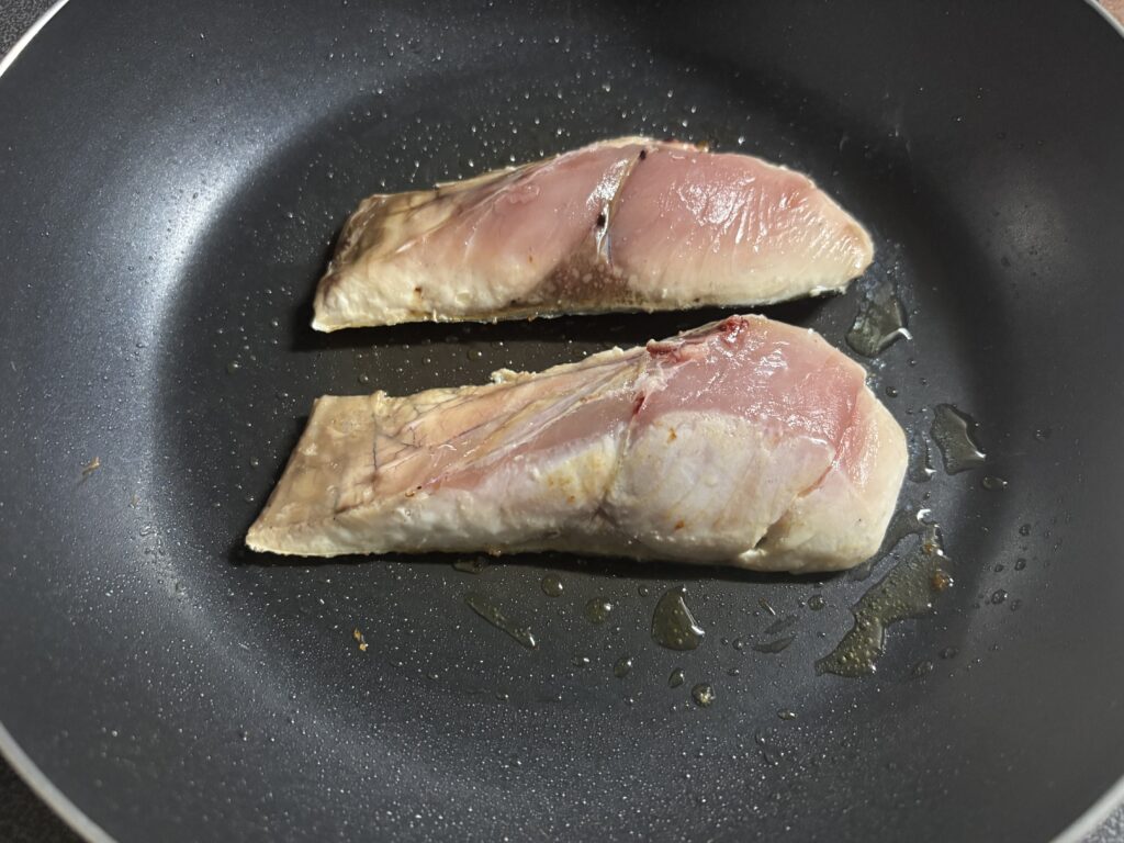 フライパンに油をひき、皮目を下にして中火でぶりを焼きます。
